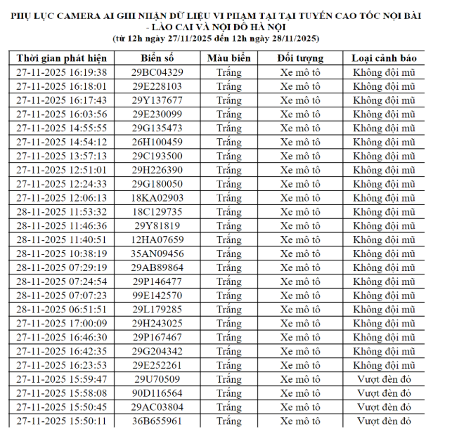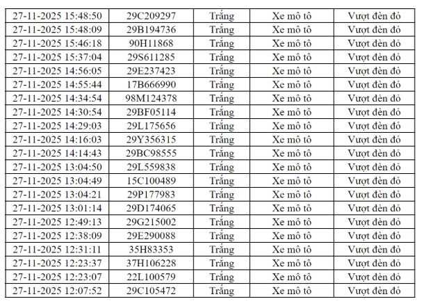 Ngoài ra, qua trích xuất dữ liệu từ camera A.I được thí điểm lắp đặt tại nội đô Hà Nội (nút giao phố Phạm Văn Bạch – Hoàng Quán Chi) từ 12h00’ ngày 27/11/2025 – 12h00’ ngày 28/11/2025, đã tự động phát hiện: 22 trường hợp người điều khiển mô tô, xe gắn máy không đội mũ bảo hiểm; 29 trường hợp không chấp hành hiệu lệnh của đèn tín hiệu – vượt đèn đỏ. Danh sách cụ thể như sau: