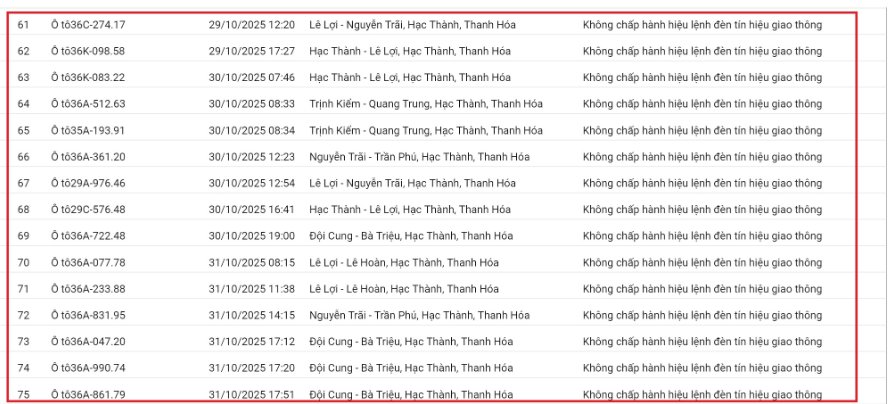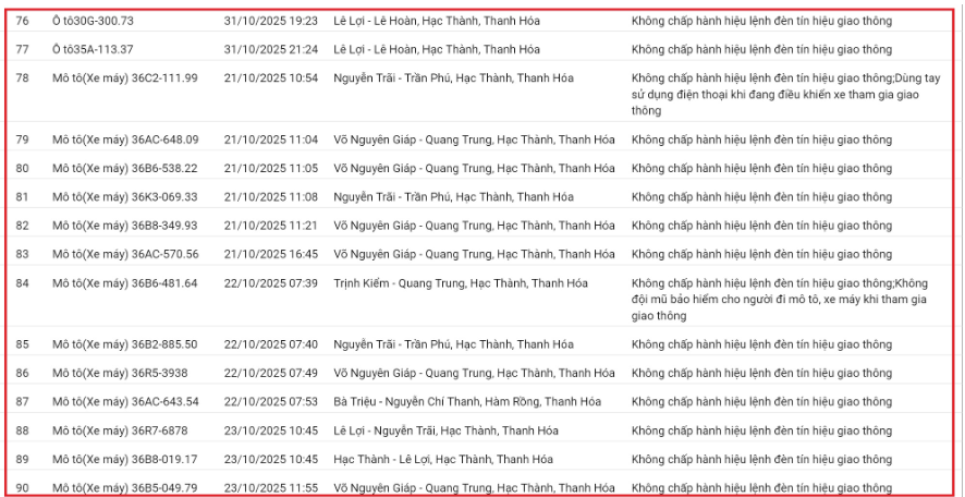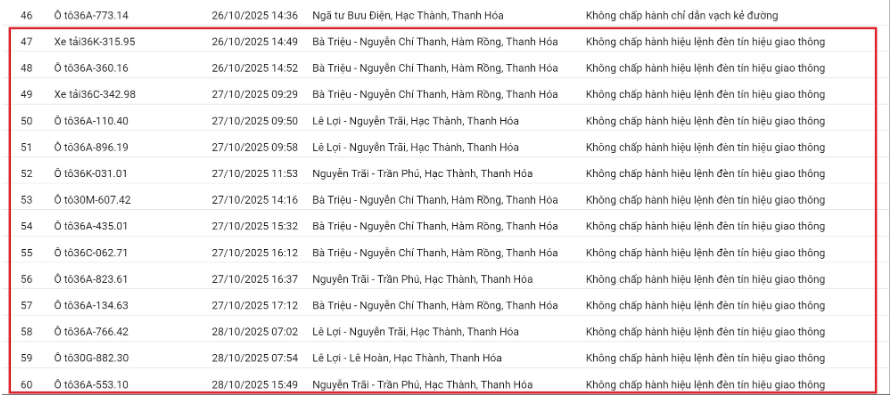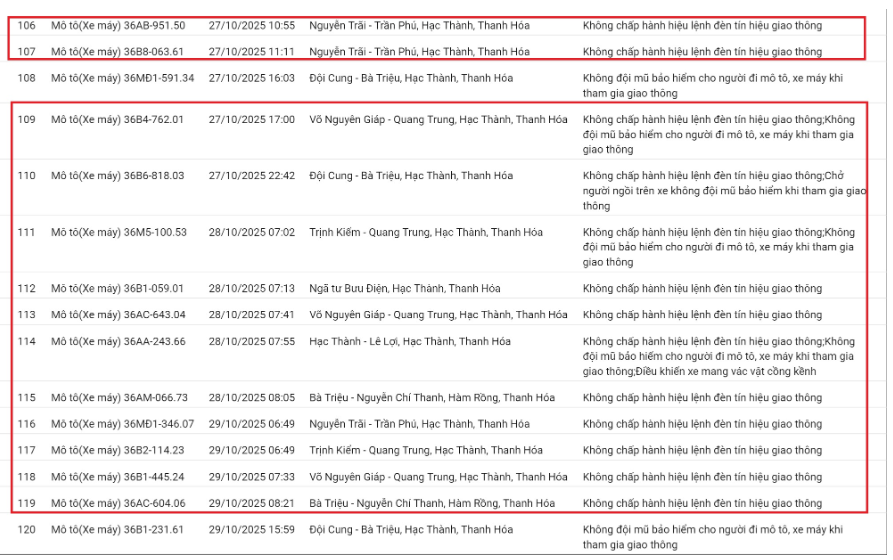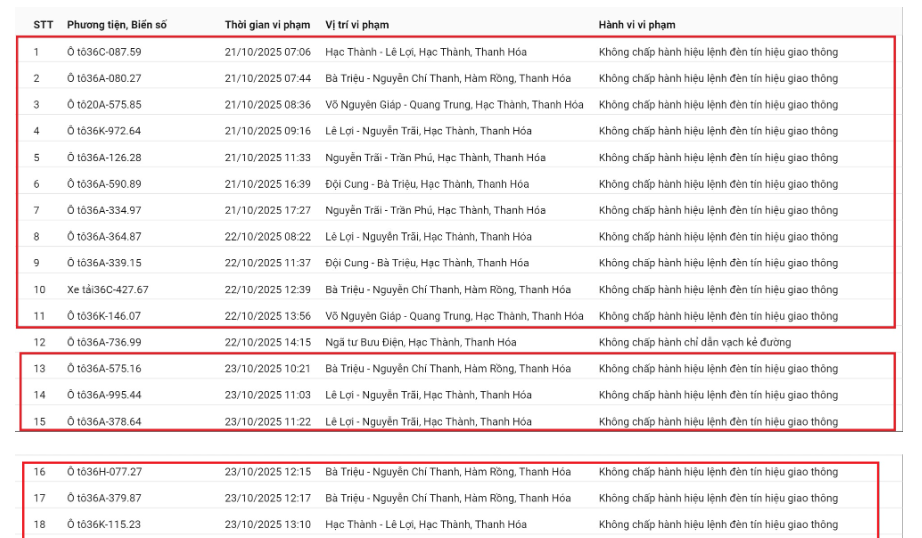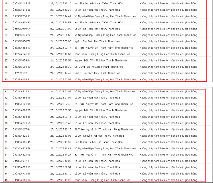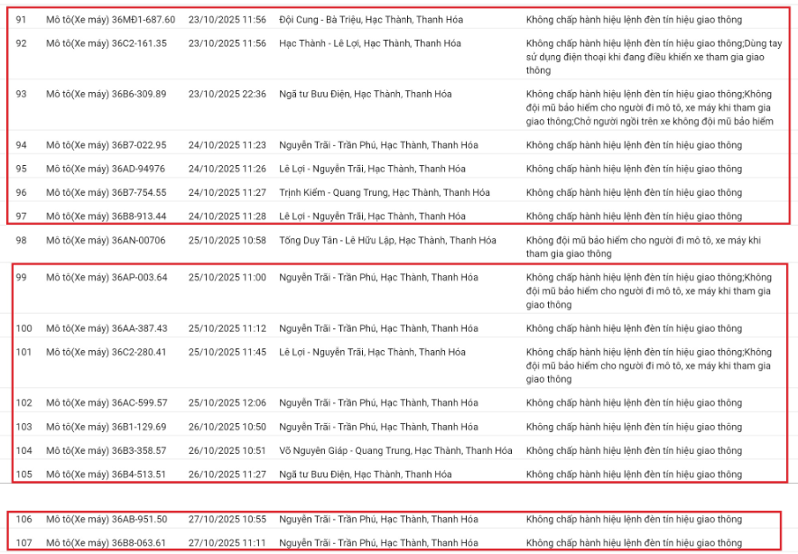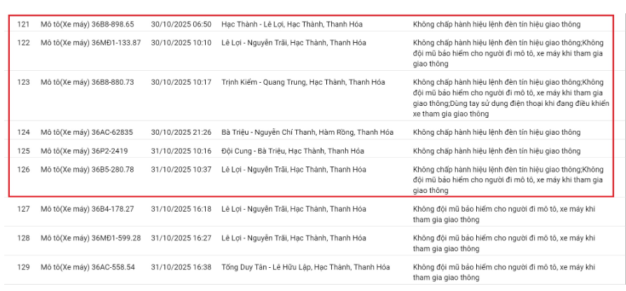 Công an tỉnh Thanh Hóa cũng thông báo, từ ngày 20/10/2025 đến ngày 31/10/2025, Phòng Cảnh sát giao thông ghi nhận 121 trường hợp ô tô và xe máy vi phạm lỗi “Không chấp hành hiệu lệnh của đèn tín hiệu giao thông”. Danh sách cụ thể như sau: