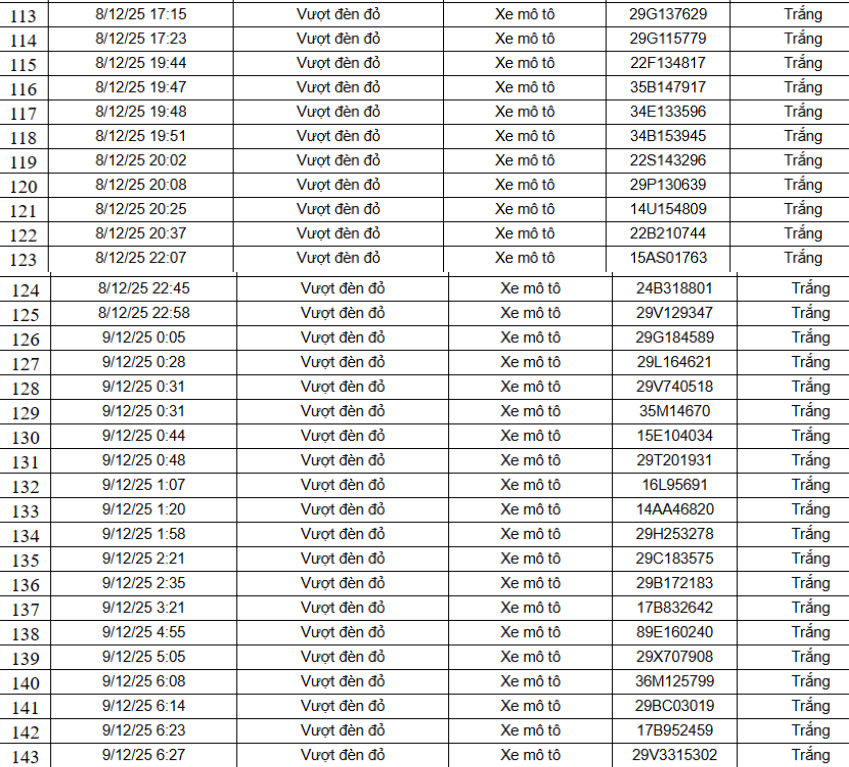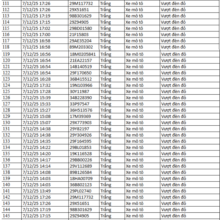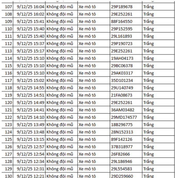 Theo Cục Cảnh sát giao thông, từ 12h00’ ngày 9/12/2025 đến 12h00’ ngày 10/12/2025, qua trích xuất dữ liệu từ camera A.I được thí điểm lắp đặt tại nội đô Hà Nội (nút giao phố Phạm Văn Bạch – Hoàng Quán Chi), đã tự động phát hiện 129 trường hợp xe mô tô (xe máy) vi phạm.