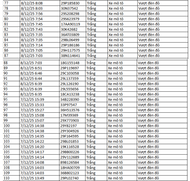 Ngày 9/12, Phòng CSGT Công an tỉnh Bắc Ninh thông báo danh sách các phương tiện vi phạm bị phạt nguội từ ngày 30/11 đến 07/12/2025.