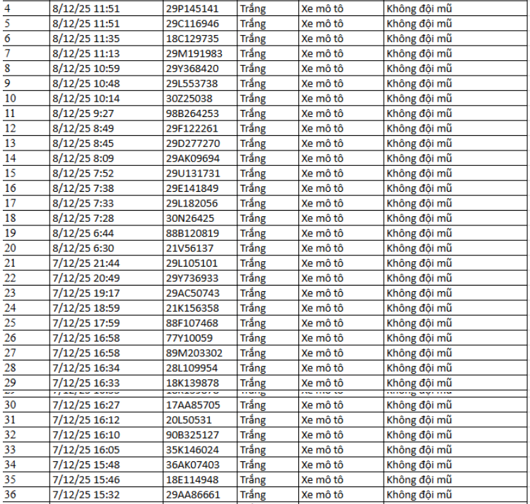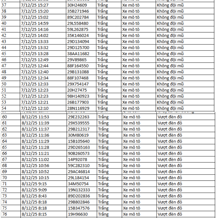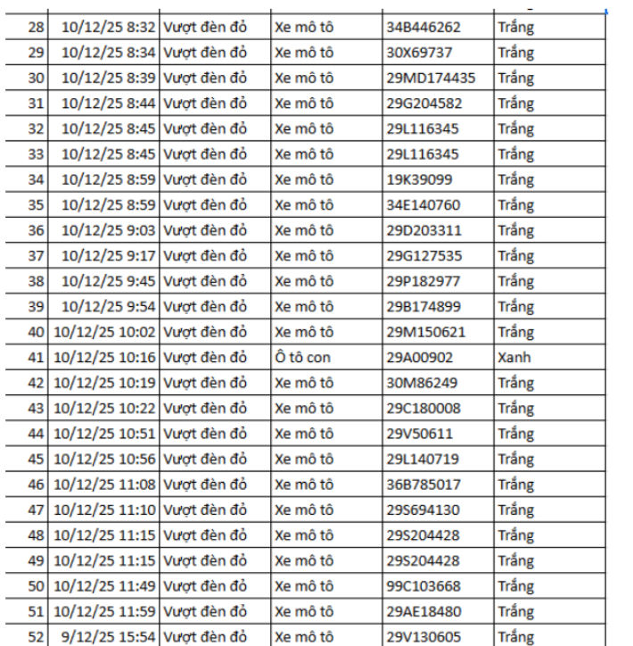 Ngày 1/12, Phòng CSGT Công an tỉnh Thanh Hóa thông báo các phương tiện vi phạm về TTATGT đường bộ được phát hiện qua Hệ thống camera giám sát an ninh, trật tự và an toàn giao thông trên địa bàn từ ngày 20/10/2025 đến ngày 31/10/2025. Theo danh sách, có 52 trường hợp xe máy vi phạm.