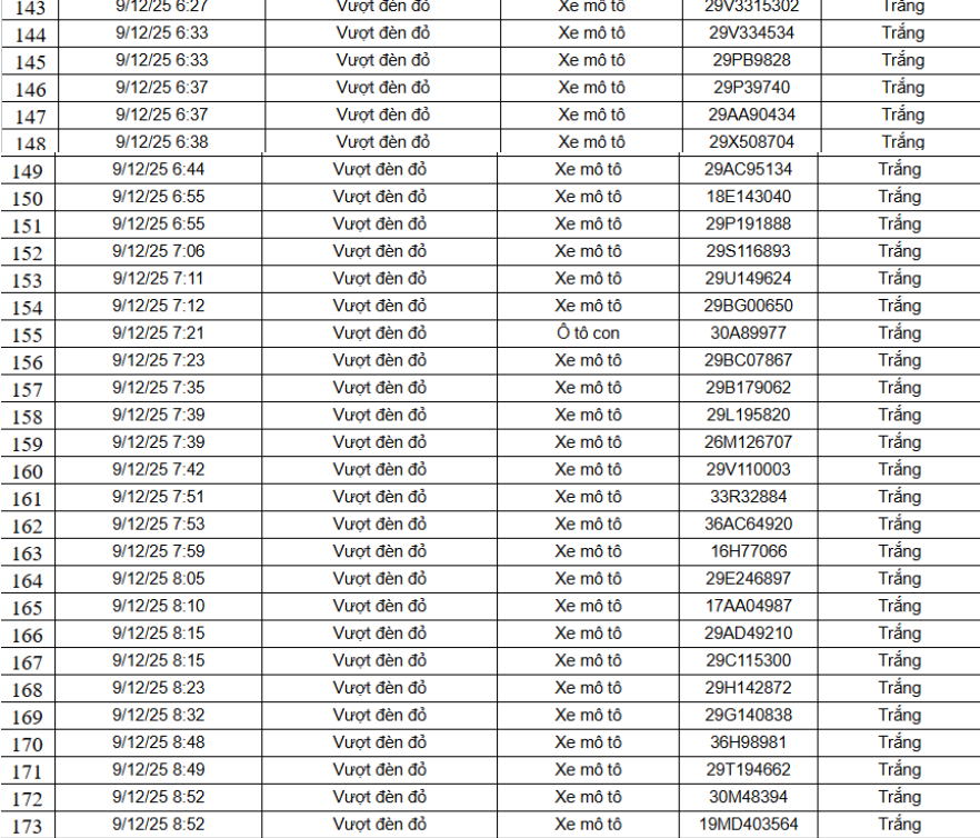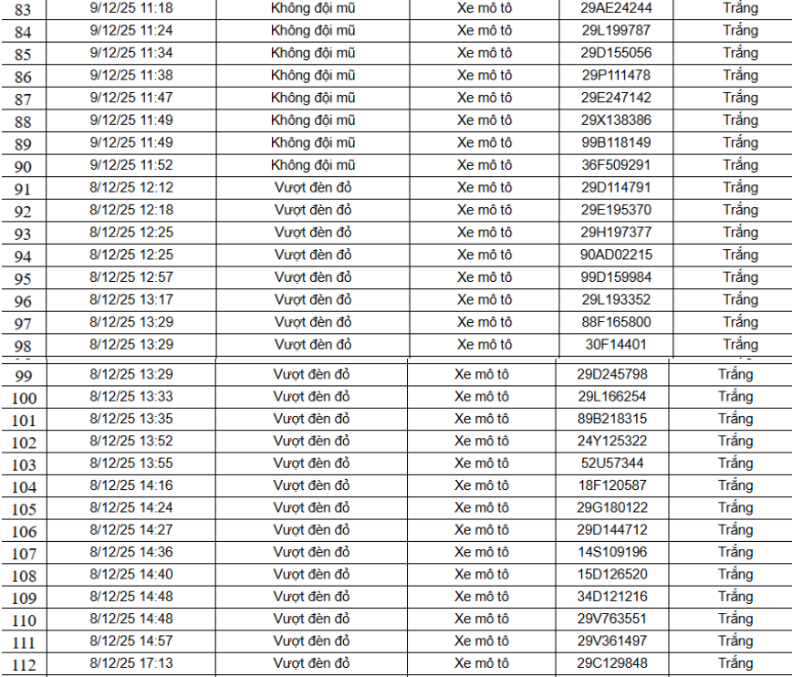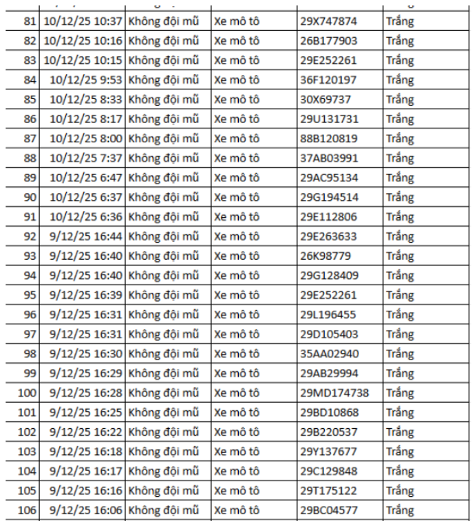 Danh sách 148 trường hợp xe máy vi phạm như sau: