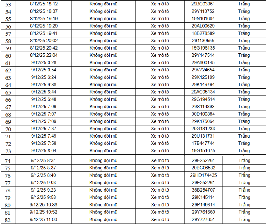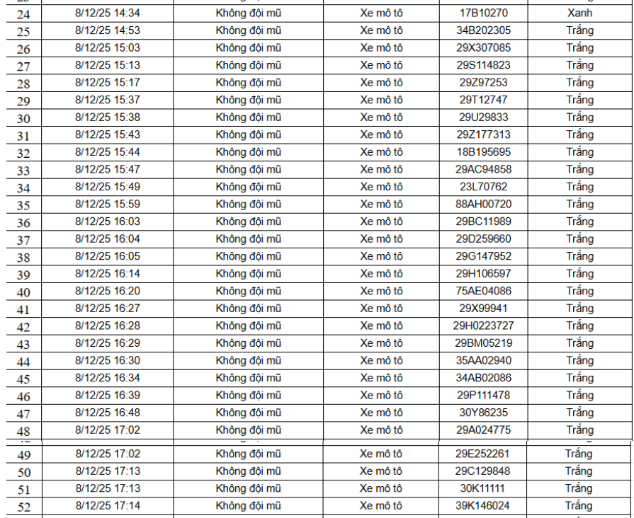 Danh sách 52 trường hợp xe máy vi phạm như sau: