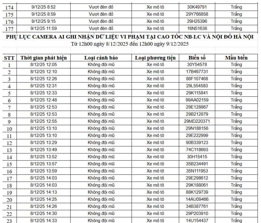 Trước đó, từ 12h00’ ngày 8/12/2025 đến 12h00’ ngày 9/12/2025, qua trích xuất dữ liệu từ camera A.I được thí điểm lắp đặt tại nội đô Hà Nội (nút giao phố Phạm Văn Bạch – Hoàng Quán Chi), đã tự động phát hiện 176 trường hợp xe mô tô (xe máy) vi phạm.