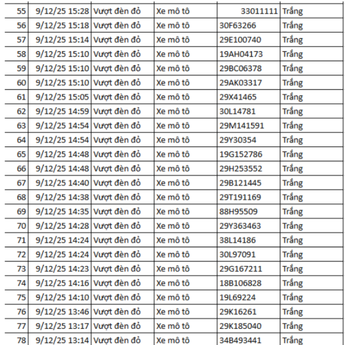 Danh sách cụ thể 78 trường hợp xe máy vi phạm như sau: