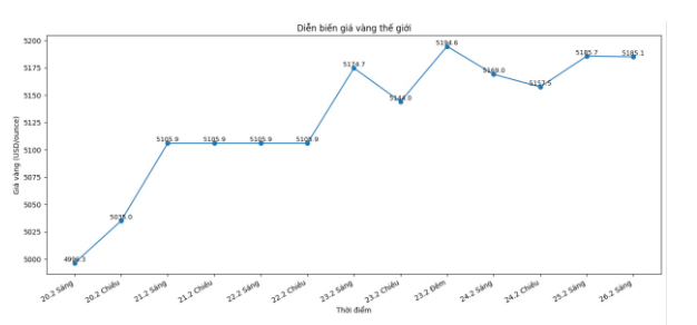 Lúc 9h08, giá vàng thế giới niêm yết quanh ngưỡng 5.185,1 USD/ounce, gần như đi ngang so với một ngày trước.