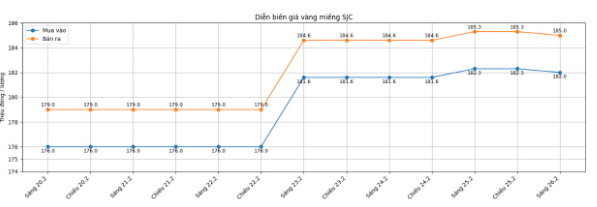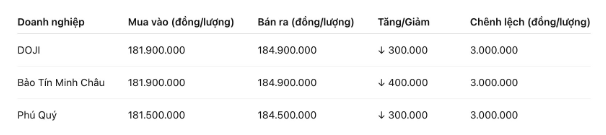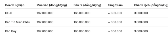 Tính đến 9h25, giá vàng miếng SJC được Tập đoàn DOJI niêm yết ở ngưỡng 182-185 triệu đồng/lượng (mua vào – bán ra), giảm 300.000 đồng/lượng cả hai chiều mua vào và bán ra. Chênh lệch giá mua vào – bán ra ở ngưỡng 3 triệu đồng/lượng.