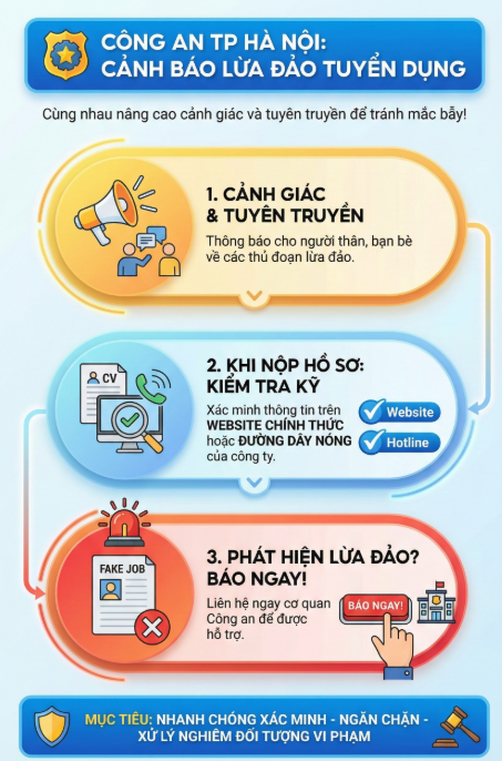 Trước sự việc trên, Công an Thành phố Hà Nội đề nghị người dân cảnh giác và tuyên truyền đến người thân, bạn bè về thủ đoạn trên, tránh mắc bẫy của đối tượng xấu. Khi làm gửi hồ sơ tuyển dụng cho các công ty, doanh nghiệp, người dân cần kiểm tra rõ các thông tin về việc tuyển dụng trên website chính thức của công ty hoặc số đường dây nóng.