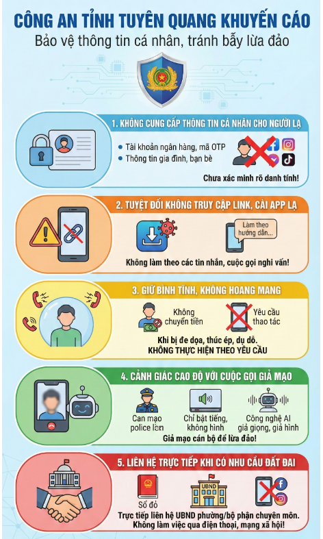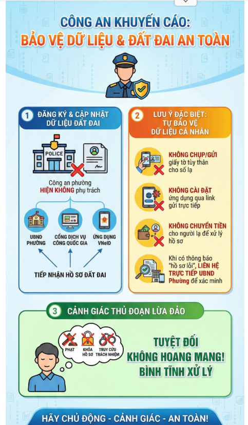 Công an tỉnh Tuyên Quang khuyến cáo người dân phải tự bảo vệ dữ liệu cá nhân. Công tác đăng ký, cập nhật dữ liệu đất đai hiện không do công an phường phụ trách. Hồ sơ liên quan đến đất đai chỉ được tiếp nhận qua Uỷ ban nhân dân phường, Cổng dịch vụ công quốc gia hoặc ứng dụng VNeID.