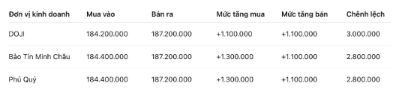 Tập đoàn Vàng Bạc Đá Quý Phú Quý niêm yết giá vàng miếng SJC ở ngưỡng 184,4-187,2 triệu đồng/lượng (mua vào – bán ra), tăng 1,3 triệu đồng/lượng chiều mua vào và tăng 1,1 triệu đồng/lượng chiều bán ra. Chênh lệch giá mua vào – bán ra ở ngưỡng 2,8 triệu đồng/lượng.