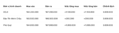 Bảo Tín Minh Châu niêm yết giá vàng nhẫn ở ngưỡng 183,5-186,5 triệu đồng/lượng (mua vào – bán ra), tăng 200.000 đồng/lượng cả hai chiều mua vào và bán ra. Chênh lệch giá mua vào – bán ra ở ngưỡng 3 triệu đồng/lượng.