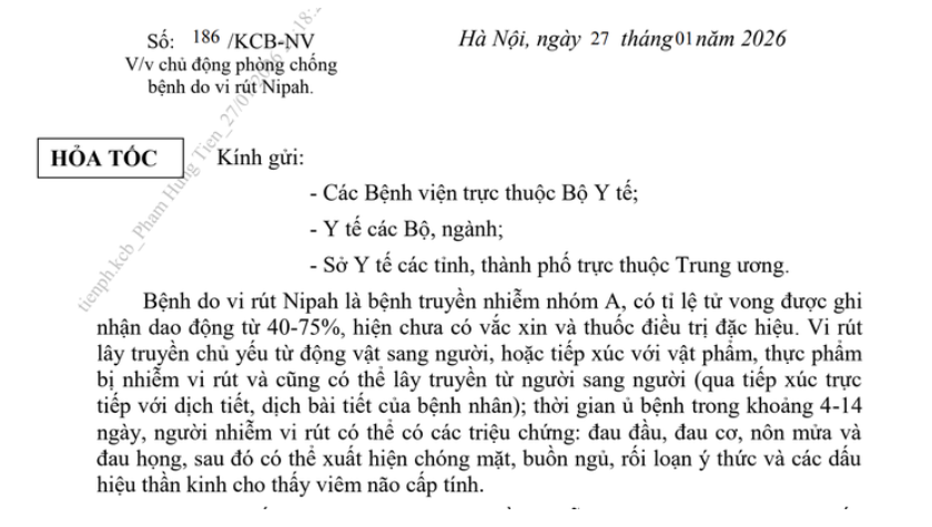 Cục Quản lý Khám, chữa bệnh (Bộ Y tế) vừa có văn bản hỏa tốc gửi các bệnh viện trực thuộc Bộ Y tế, cơ sở y tế các bộ, ngành và Sở Y tế các tỉnh, thành phố, yêu cầu tăng cường các biện pháp phòng, chống bệnh do virus Nipah trước nguy cơ xâm nhập, trong bối cảnh Ấn Độ ghi nhận các ca mắc mới.