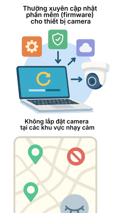 Không lắp đặt camera tại các khu vực nhạy cảm (phòng ngủ, phòng thay đồ,…) nếu như không thực sự cần thiết; hoặc sử dụng chức năng che chắn vật lý khi không sử dụng.