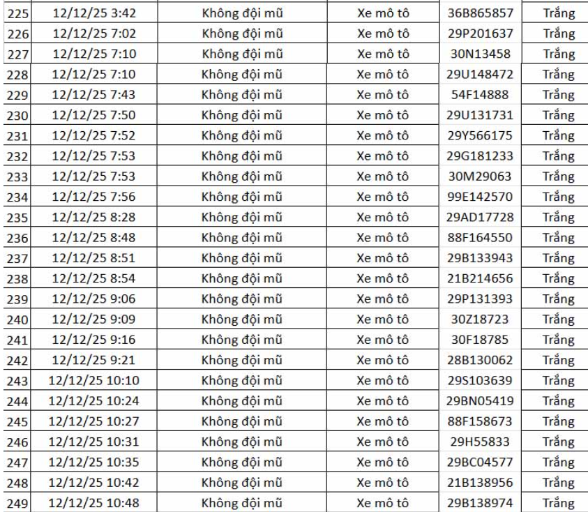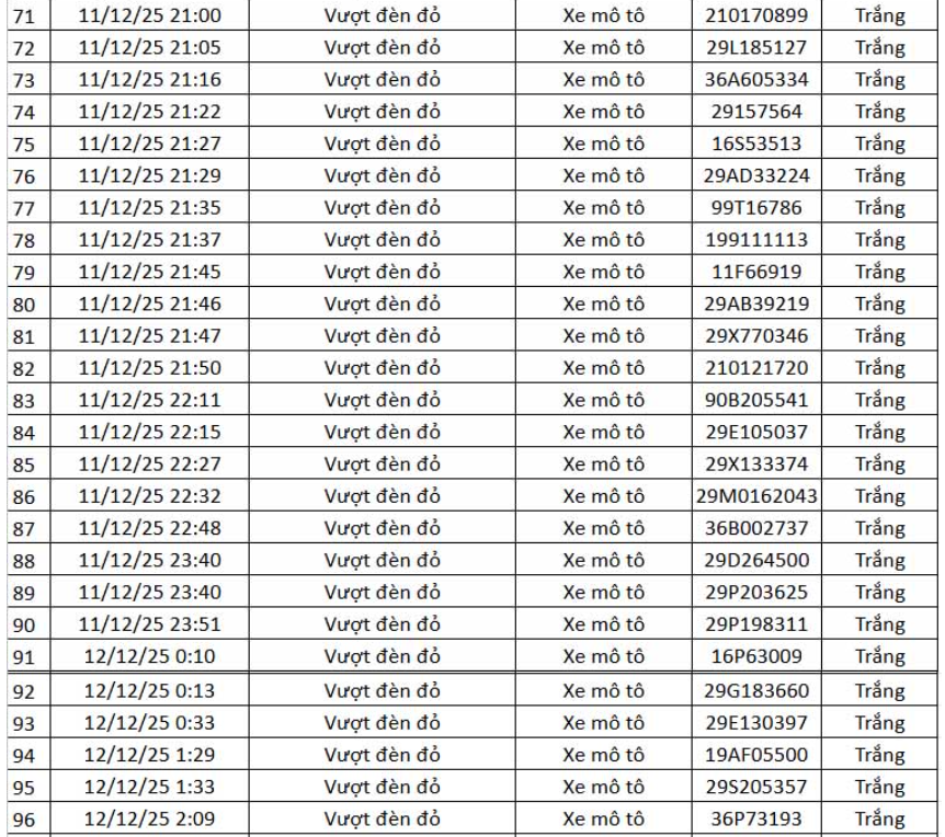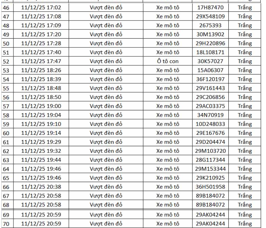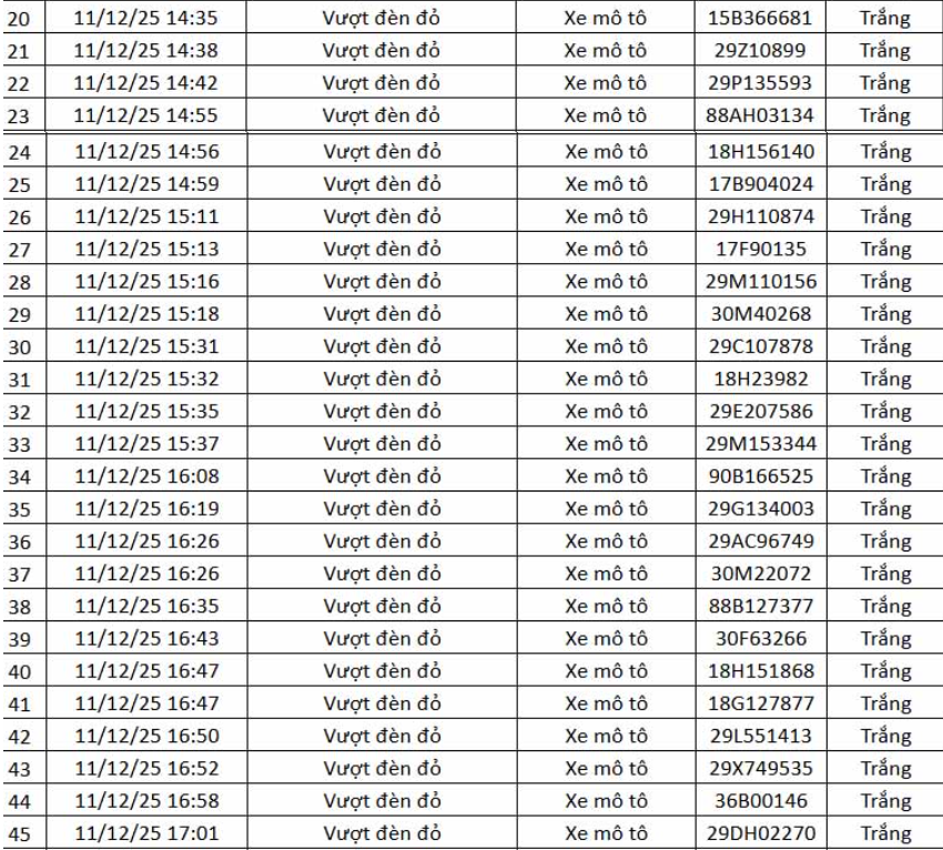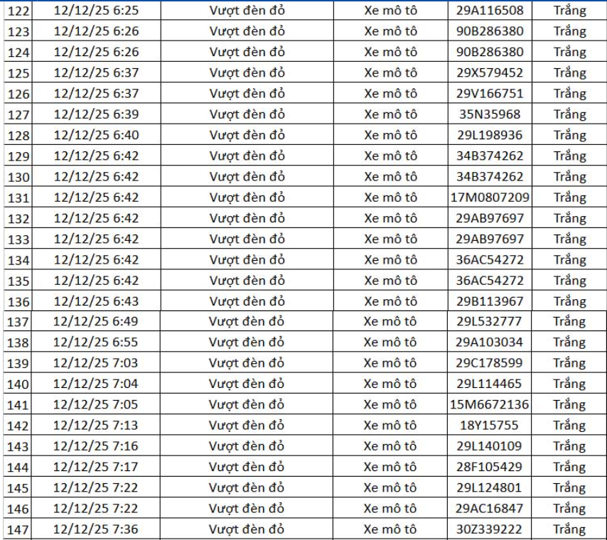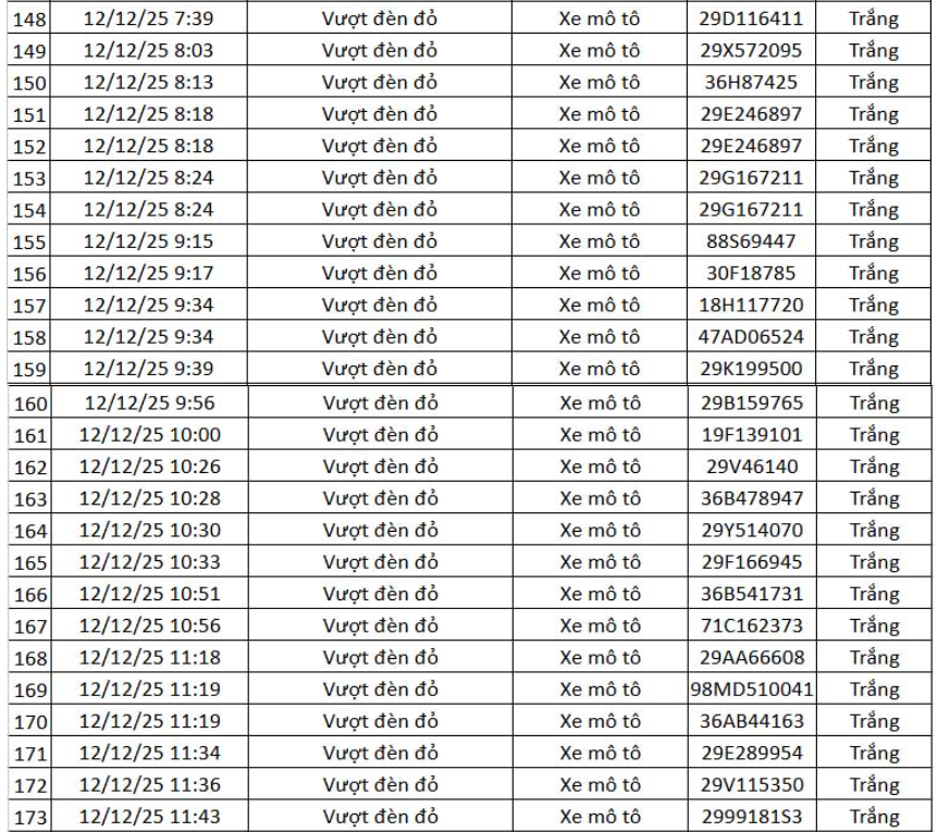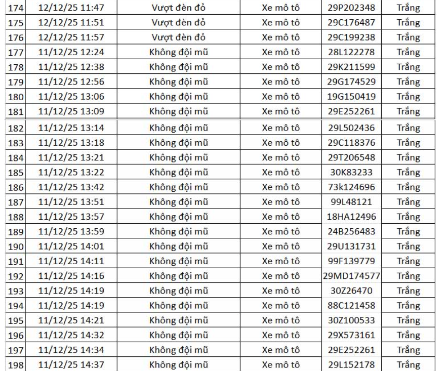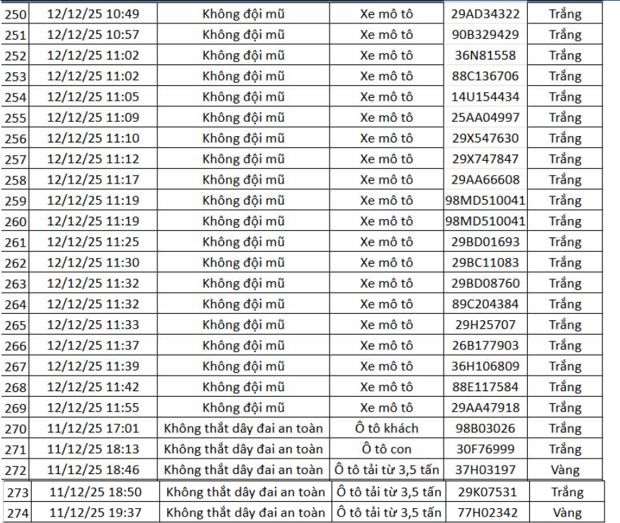 Thông tin từ Cục Cảnh sát giao thông (CSGT) – Bộ Công an, trong khoảng thời gian từ 12h ngày 11.12.2025 đến 12h ngày 12.12.2025, hệ thống camera ứng dụng trí tuệ nhân tạo (AI) đã ghi nhận và phát hiện nhiều hành vi vi phạm trật tự, an toàn giao thông trên tuyến cao tốc Nội Bài – Lào Cai và khu vực nội đô Hà Nội.