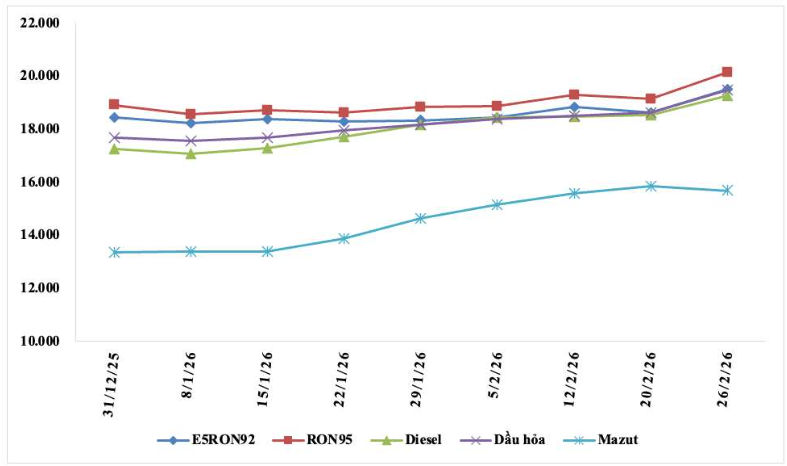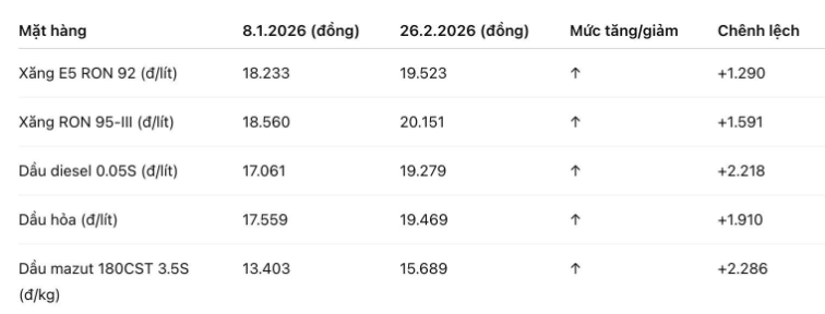 So với kỳ điều hành đầu tiên của năm – ngày 8.1.2026, đến ngày 26.2.2026, giá các mặt hàng xăng dầu đều tăng.