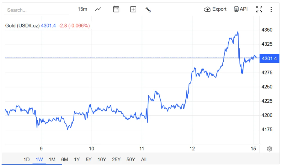 Giá vàng thế giới giao ngay trên thị trường châu Á lúc 7 giờ 15 sáng nay ngày 15/12 (giờ Việt Nam) giao dịch ở quanh ngưỡng 4.301 USD/ounce, tăng 5 USD/ounce so với chốt phiên tuần vừa qua.