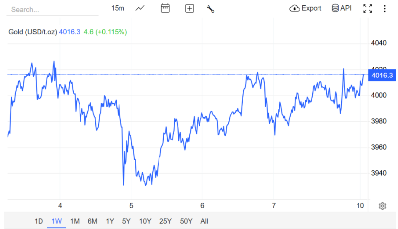 Sáng 10/11 (giờ Việt Nam), giá vàng giao ngay trên thị trường châu Á được ghi nhận quanh 4.016 USD/ounce, tăng khoảng 17 USD/ounce so với mức đóng cửa cuối tuần trước.