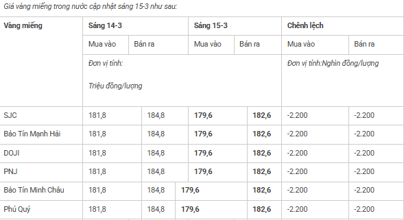 Các thương hiệu SJC, Bảo Tín Mạnh Hải, DOJI, PNJ, Bảo Tín Minh Châu, Phú Quý cùng giảm giá vàng miếng 2,2 triệu đồng/lượng ở cả hai chiều so với hôm qua, giao dịch vàng miếng ở mức 179,6 – 182,6 triệu đồng/lượng (mua vào – bán ra).