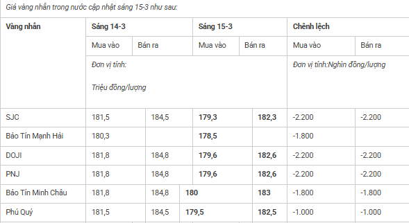 Giá vàng hôm nay (15-3): Giảm mạnh ở cả hai chiều