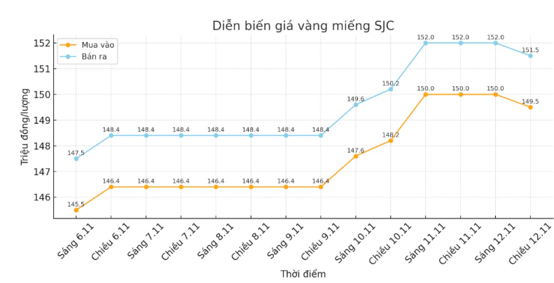PNJ giao dịch vàng nhẫn ở khoảng 151,0 – 154,0 triệu đồng/lượng, trong khi Phú Quý niêm yết cao hơn đôi chút, ở mức 151,4 – 154,4 triệu đồng/lượng.
