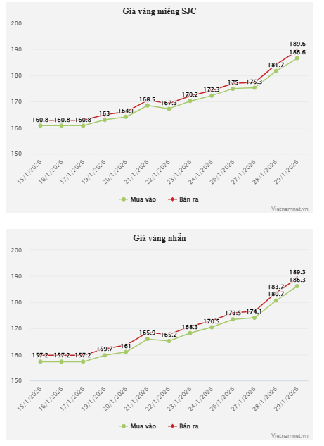 Ngày 29/1, giá vàng miếng SJC đóng cửa tại mức 186,6-189,6 triệu đồng/lượng (mua vào – bán ra), tăng 4,9 triệu đồng/lượng ở chiều mua vào và đắt hơn 5,4 triệu đồng/lượng ở chiều bán ra so với kết phiên giao dịch hôm qua. Trong ngày hôm qua, giá vàng miếng SJC có thời điểm được điều chỉnh lên mức 188,3-191,3 triệu đồng/lượng (mua – bán)