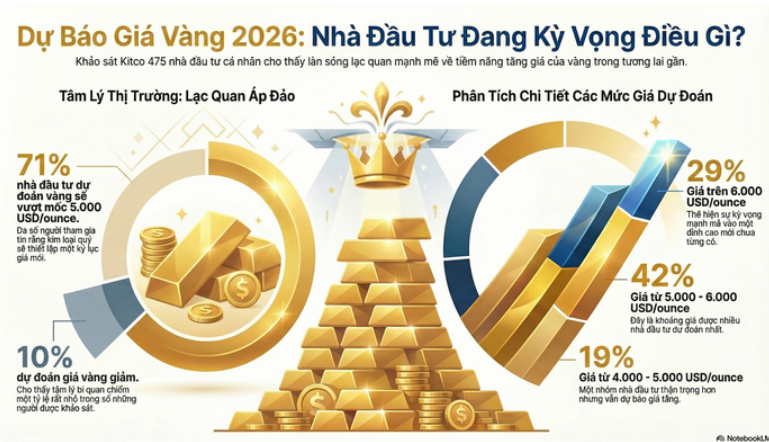 Khảo sát vàng thường niên của Kitco cho thấy, các nhà đầu tư cá nhân tin tưởng vào tiềm năng tăng giá của kim loại quý này, trong khi các ngân hàng lớn và các chuyên gia trong ngành cũng kỳ vọng giá vàng sẽ tiếp tục đi lên năm 2026.