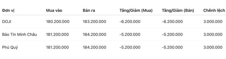 Giá vàng miếng SJC được Bảo Tín Minh Châu niêm yết ở ngưỡng 181,2-184,2 triệu đồng/lượng (mua vào – bán ra), giảm 5,2 triệu đồng/lượng chiều mua vào và giảm 5,4 triệu đồng/lượng chiều bán ra. Chênh lệch giá mua vào – bán ra ở ngưỡng 3 triệu đồng/lượng.