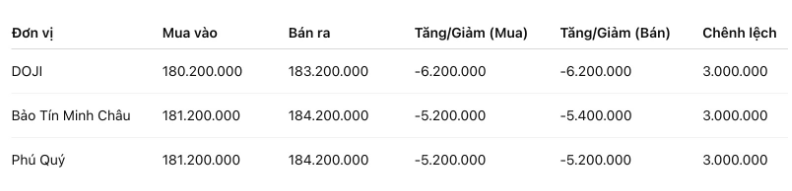 Tính đến 9h40, giá vàng miếng SJC được Tập đoàn DOJI niêm yết ở ngưỡng 180,2-183,2 triệu đồng/lượng (mua vào – bán ra), giảm 6,2 triệu đồng/lượng cả hai chiều mua vào và bán ra. Chênh lệch giá mua vào – bán ra ở ngưỡng 3 triệu đồng/lượng.