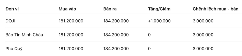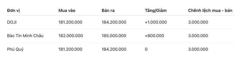 Tính đến 9h00, giá vàng miếng SJC được Tập đoàn DOJI niêm yết ở ngưỡng 181,2-184,2 triệu đồng/lượng (mua vào – bán ra), tăng 1 triệu đồng/lượng cả hai chiều mua vào và bán ra. Chênh lệch giá mua vào – bán ra ở ngưỡng 3 triệu đồng/lượng.