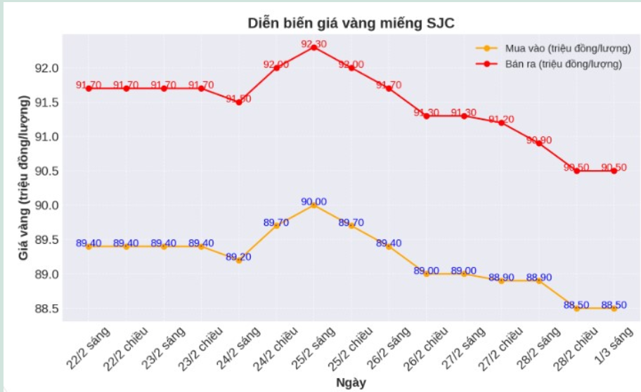 Diễn biến giá vàng SJC những phiên gần đây. Biểu đồ: Phan Anh