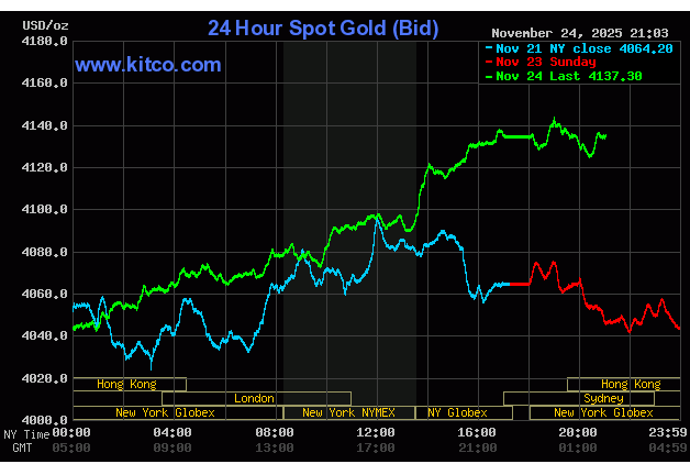 Diễn biến giá vàng thế giới trong 24h giờ qua. (Nguồn: Kitco News).
