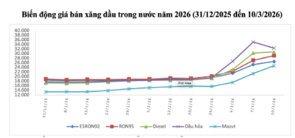 Thực hiện Nghị quyết số 36/NQ-CP của Chính phủ ngày 6/3/2026 về một số giải pháp cấp bách ứng phó trong xung đột tại Trung Đông đang diễn ra, trong đó cho phép điều chỉnh giá xăng dầu khi giá cơ sở tăng từ 7% so với giá cơ sở kỳ điều hành liền kề, lúc 23 giờ 45 phút ngày 10/3, liên Bộ Công Thương – Bộ Tài chính đã quyết định điều chỉnh tăng giá xăng, chi Quỹ bình ổn giá xăng dầu.