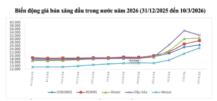 Bình quân giá thành phẩm xăng dầu thế giới giữa kỳ ngày 07/3/2026 và kỳ điều hành ngày 10/3/2026 là: 139,300 USD/thùng xăng RON92 dùng để pha chế xăng E5RON92 (tăng 29,570 USD/thùng, tương đương tăng 26,95%); 147,500 USD/thùng xăng RON95 (tăng 31,335 USD/thùng, tương đương tăng 26,97%); 188,200 USD/thùng dầu hỏa (tăng 7,320 USD/thùng, tương đương tăng 4,05%); 184,430 USD/thùng dầu diesel 0,05S (tăng 30,945 USD/thùng, tương đương tăng 20,16%); 882,380 USD/tấn dầu mazut 180CST 3,5S (tăng 257,995 USD/tấn, tương đương tăng 41,32%).