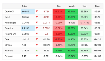 Dầu WTI giao ngay bán ra giảm xuống mức 86 USD/thùng, giảm 8,7 USD/ thùng theo ngày, tương đương mức giảm 9,21%. Giá dầu thô Brent ngọt nhẹ giao dịch gần 90,7 USD/thùng, giảm 8,2 USD/thùng, tương đương mức giảm 8,3% theo ngày.