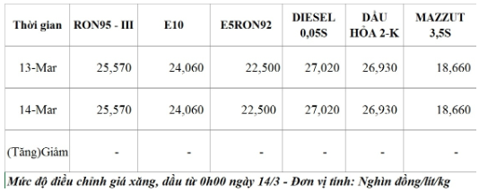 Tại kỳ điều hành tối 13/3, giá xăng RON95-III là 25.570 đồng/lít; Giá xăng E10 là 24.060 đồng/lít; giá xăng E5RON92 là 22.500 đồng/lít; Giá dầu diesel 0.05S là 27.020 đồng/lít; Giá dầu hỏa là 26.930 đồng/lít; Giá dầu mazut 180CST 3.5S kỳ này là 18.660 đồng/kg.