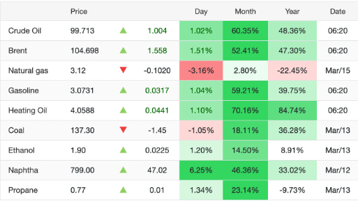 Rạng sáng nay, giá các loại dầu thô thế giới ngày 16/3 đều bật tăng so với chốt phiên cuối tuần trước. Theo trang Trading Economics, ghi nhận lúc 6 giờ 00 phút sáng nay 16/3 giờ Việt Nam, giá dầu thô thế giới niêm yết ở ngưỡng 100 USD/thùng.
