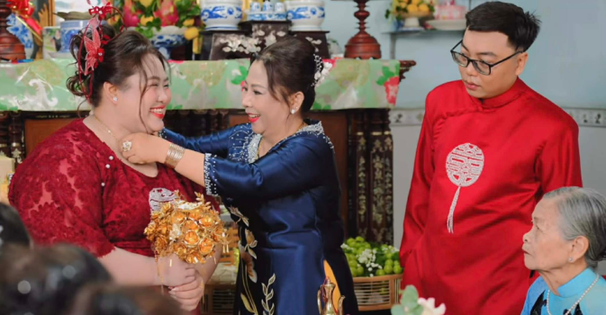 Cô Hồng (áo dài tím than) trao vàng cho con dâu.