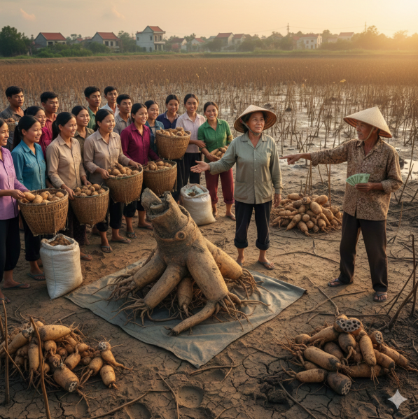Đám người cười rần rần, nhưng càng đào thì càng choáng. Một củ chính, dài cỡ một mét rưỡi, nặng phải sáu bảy chục ký. Từ nó tua ra từng nhánh rễ phụ, mỗi nhánh lại là một củ riêng, to nhỏ khác nhau, đếm chừng hơn trăm cái. Những người lớn tuổi nói chưa bao giờ thấy thứ gì như thế, dù cả đời làm ruộng, lội bùn.