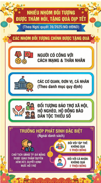 Nhằm chăm lo đời sống cho các đối tượng chính sách trong dịp Tết Nguyên đán 2026, HĐND thành phố Đà Nẵng đã ban hành Nghị quyết số 39/2025/NQ-HĐND, quy định cụ thể việc thăm hỏi, tặng quà Tết trên địa bàn thành phố.