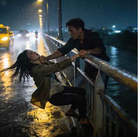 Tôi nghiến răng, dồn hết sức ép người vào lan can, kéo cô ấy sát lại. “Nếu em muốn chết, ít nhất… nhìn xem anh đang cố thế nào để em sống!” Tôi thở dốc, nước mưa lẫn nước mắt mặn chát.